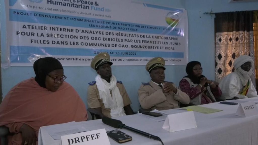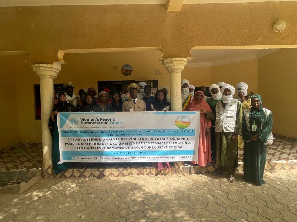 Du 27 au 28 juin 2025, s’est tenu à Gao l’atelier interne d’analyse des résultats de la cartographie menée dans les communes de Gao, Gounzoureye et Kidal, en vue de sélectionner des Organisations de la Société Civile (OSC) dirigées par des femmes et des jeunes filles.