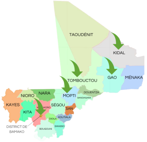 Pilotée par l’équipe de coordination depuis Bamako, L’ONG ADD a implanté plusieurs projets/ programmes dans le centre et le nord du Mali. Il s’agit notamment des régions de Mopti, Tombouctou, Gao et Kidal.